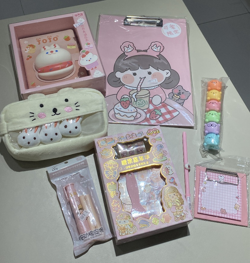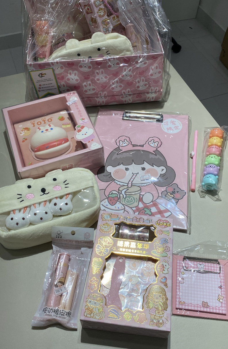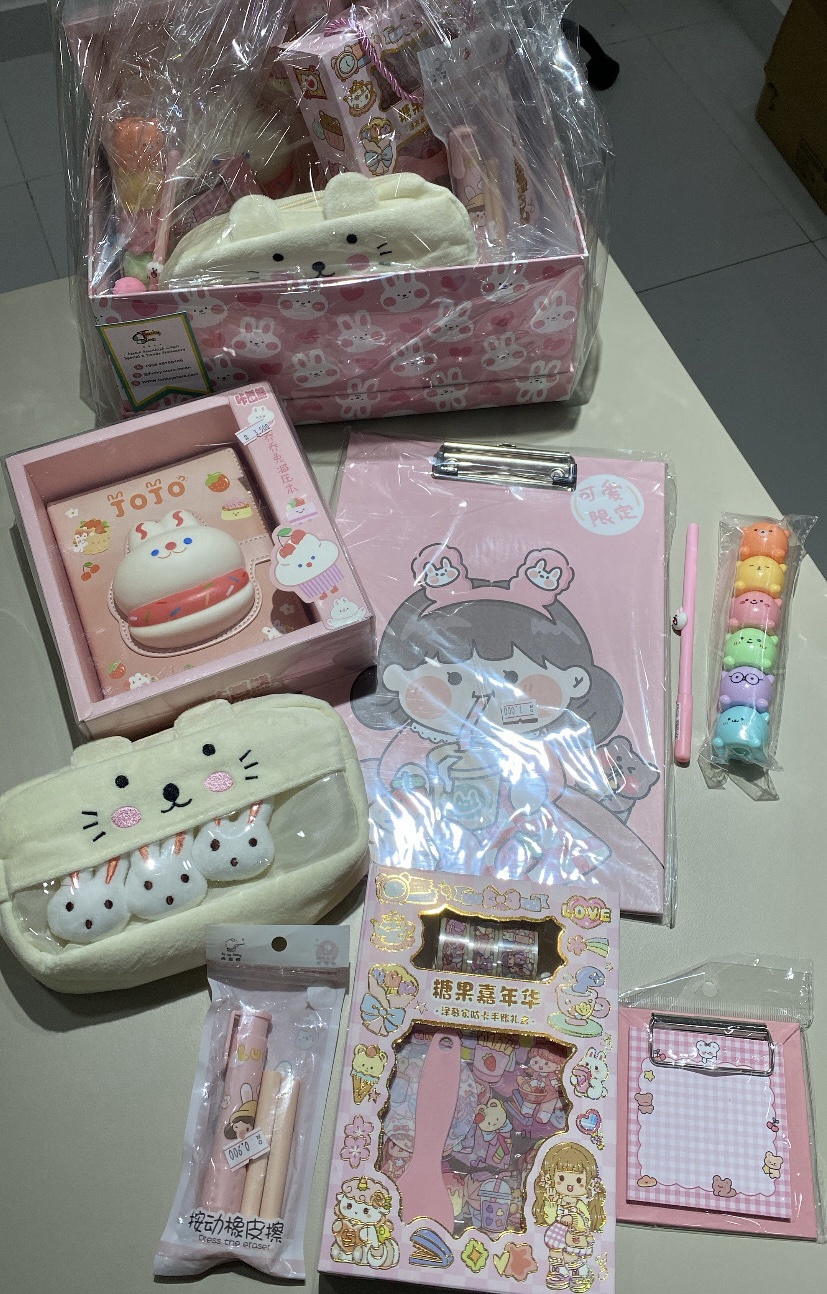 بورد ورق ، دفتر سكوشي ، هايلايتر ، قلم حبر ، محايات ، نوتات لاصقة ، مقلمة ، بوكس ستيكرات مع ميدالية